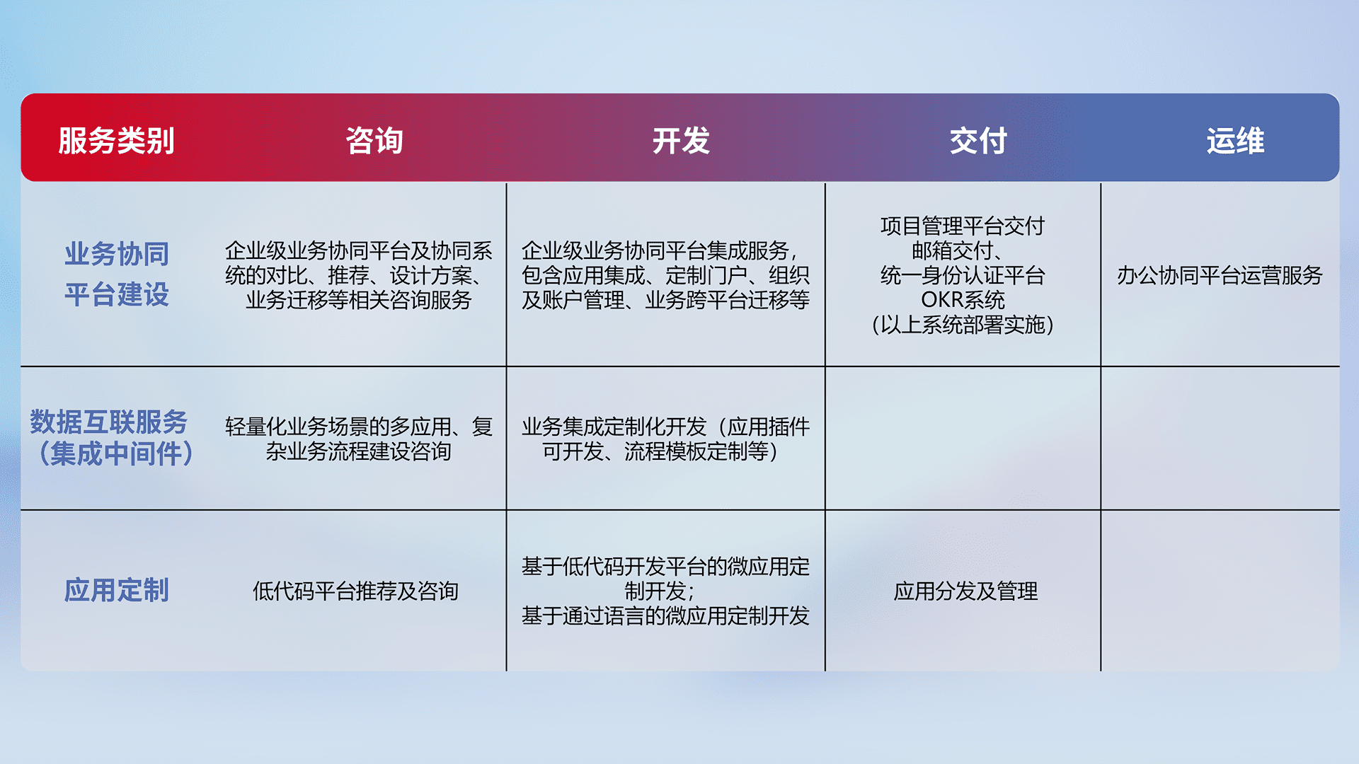 针对钉钉、、企微、、IDaas等平台级产品提供产品的规划、、方案、、、、交付、、定制化开发等服务,,实现如统一协同办公、、、智能客户服务、、、、混合会议管理、、智能数据查询、、等业务场景,,,实现数字化转型。。。。