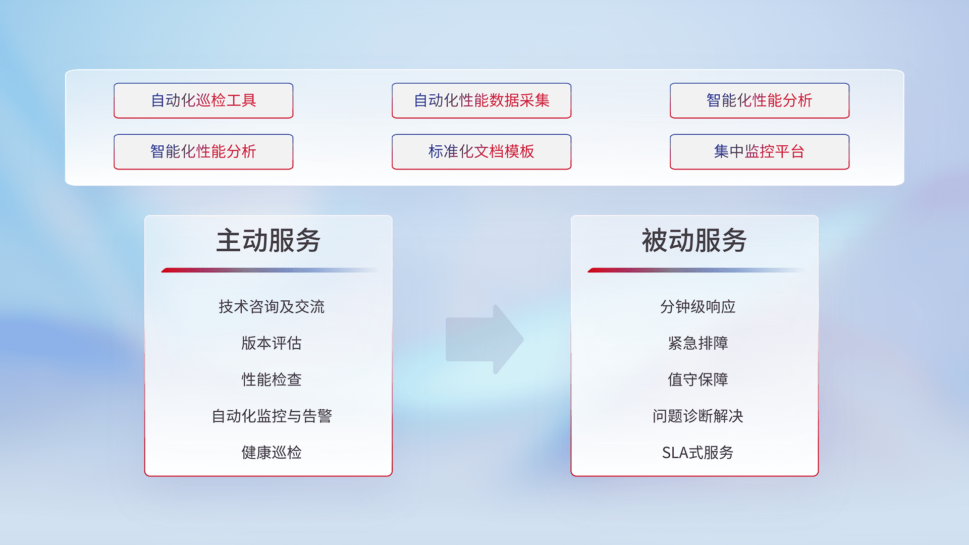 智能化工具和标准化文档,,,,保障服务质量,,,提供主动服务(包含技术咨询、、、、版本评估、、、性能检查、、、自动化监控与告警、、、健康巡检)和被动服务包含(分钟级响应、、、紧急排障、、值守保障、、、、问题诊断解决、、SLA服务)。。
